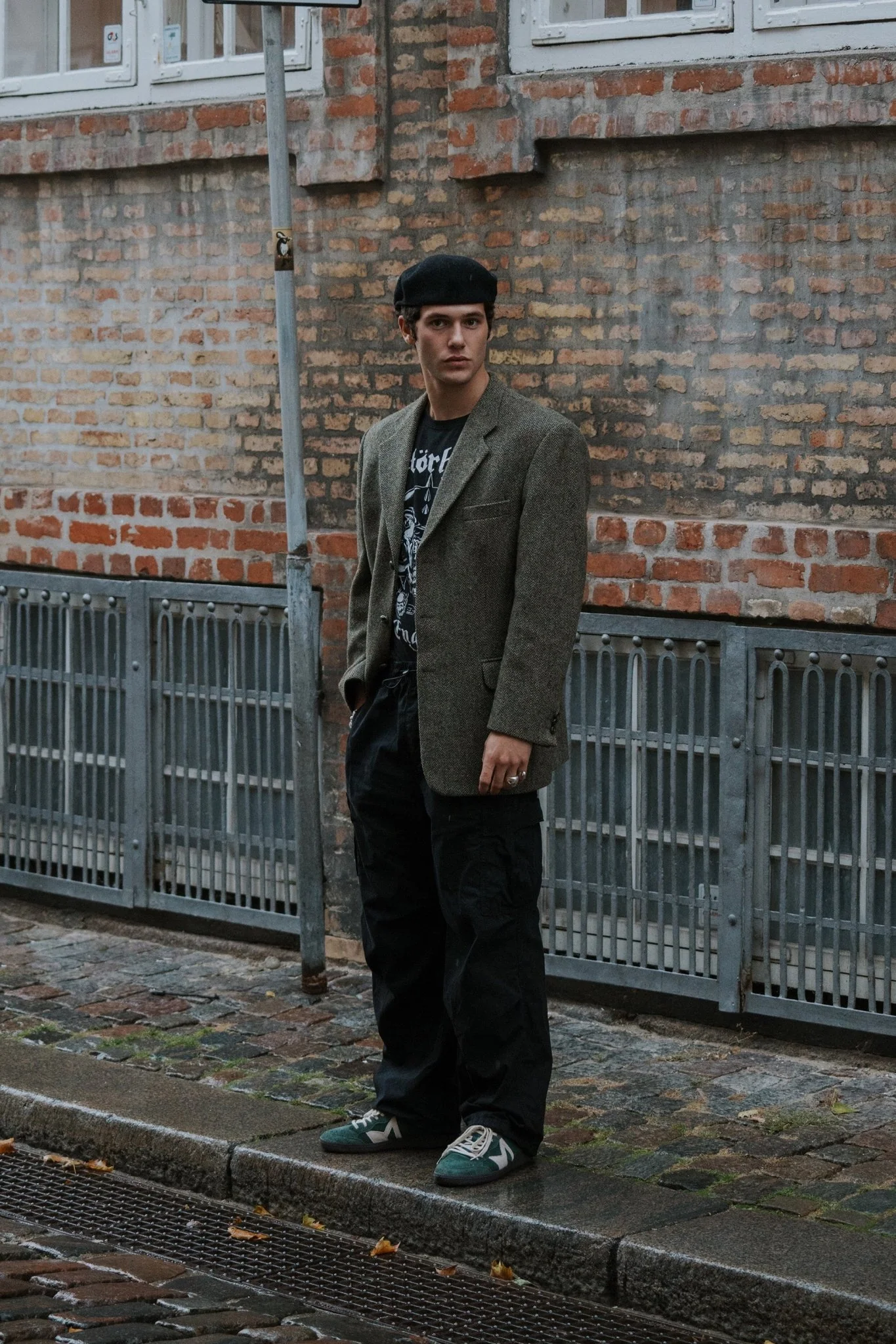 Zapatilla fabricada en combinación de serrajes verdes de diferentes texturas y detalles de serraje blanco roto. La suela es gris oscuro.